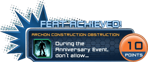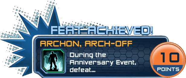 | Archon, Arch-Off | Metropolis Anti-Matter Invasion Zone: Defeat 13 fully-formed Shadow Demon Archons | 10 Points | 2017- |