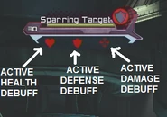 Debuffs are the little red symbols under under the players or enemies names. Some of the symbols appear in the shape of a red heart, shield, and a red reticle.