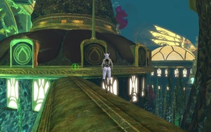 - Location: On a ledge of a tower-like building right at the near side of the large far left squarge shaped housing block.