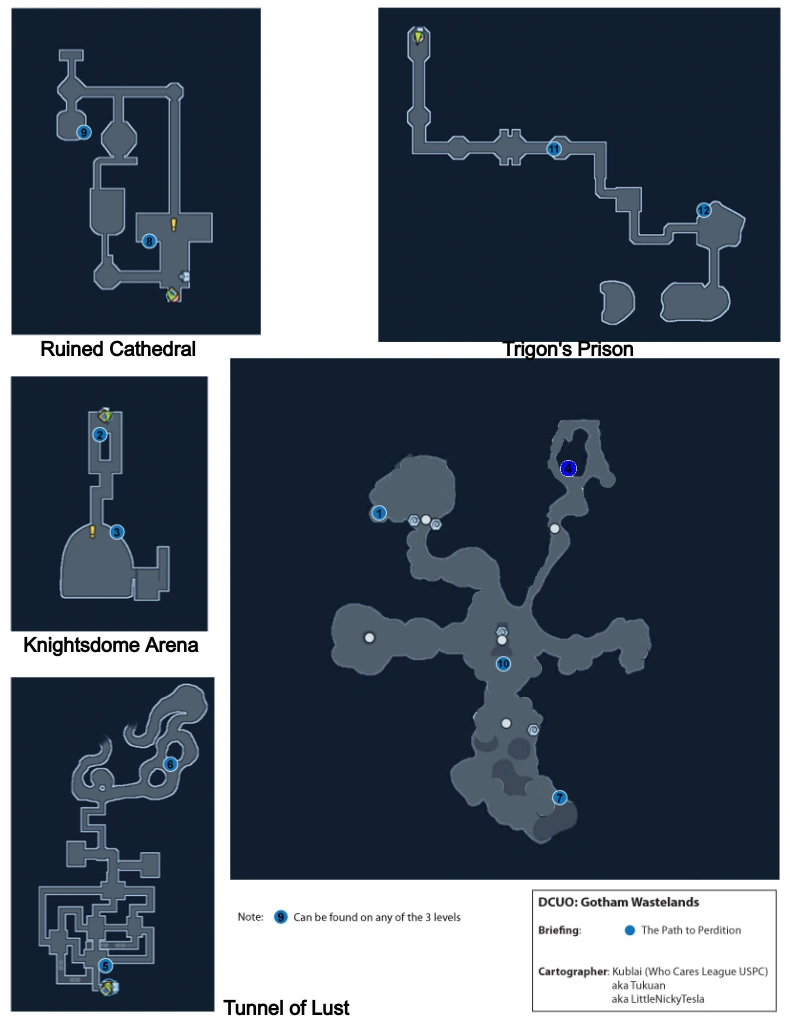 The Path to Perdition is a Global Briefing that can be found in the Gotham Wastelands, the Tunnel of Lust, Ruined Cathedral, Knightsdome Arena and the Trigon's Prison alert. There are twelve parts that comprise this briefing.